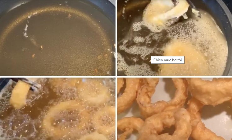 Sau khi mực vàng đều thì vớt ra, chuẩn bị một chảo khác, cho 2 muỗng bơ thực vật cho tan, rồi bỏ tỏi bằm vào phi thơm. Sau đó cho mực vừa chiên vào, xóc đều để bơ tỏi phủ đều mực là được.
