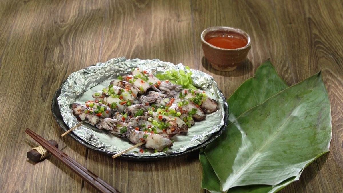 Mực trứng nướng mỡ hành thơm phức, mực dai ngọt, ăn kèm mực nướng với chén nước mắm chua ngọt kèm tóp mỡ thơm lừng, giòn rụm, ăn là ghiền ngay đấy.