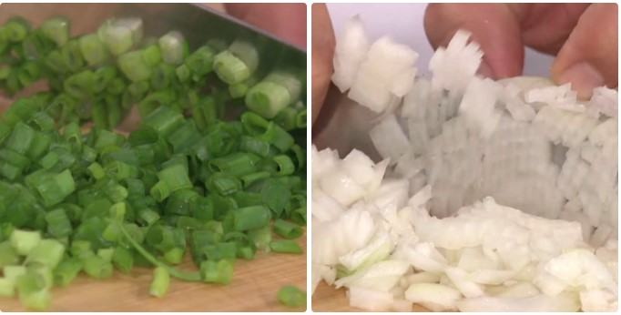 Hành lá bỏ gốc, rửa sạch, đầu hành đập dập, cắt nhỏ. Phần lá cắt nhỏ.