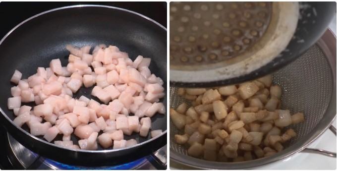 Mở heo rửa sạch với nước, sau đó cắt hạt lựu nhỏ, cho vào chảo thắng cùng với 1 ít nước trong khoảng 15 phút trên lửa vừa.