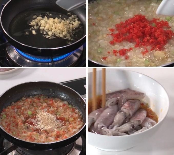 Hỗn hợp sốt ướp nguội, bạn cho mực vào tô và ướp khoảng 10 phút để mực thấm gia vị.