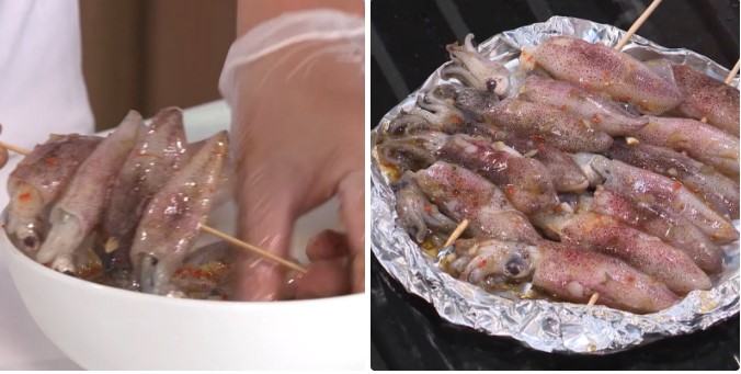 Sau đó, bạn dùng xiên tre, xiên ngang vào thân mực. Tiếp đến,bạn dùng giấy bạc bọc dĩa lại cho mực lên giấy bạc rồi cho vào lò nướng ở nhiệt độ 200 độ C khoảng 10 phút là mực chín.