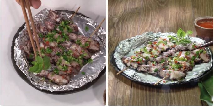 Mực nướng chín, bạn lấy mực ra rưới mỡ hành lên nữa là hoàn thành rồi.