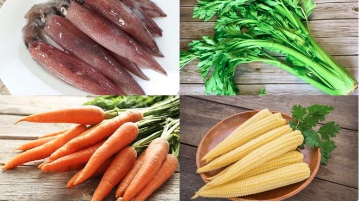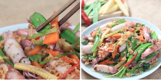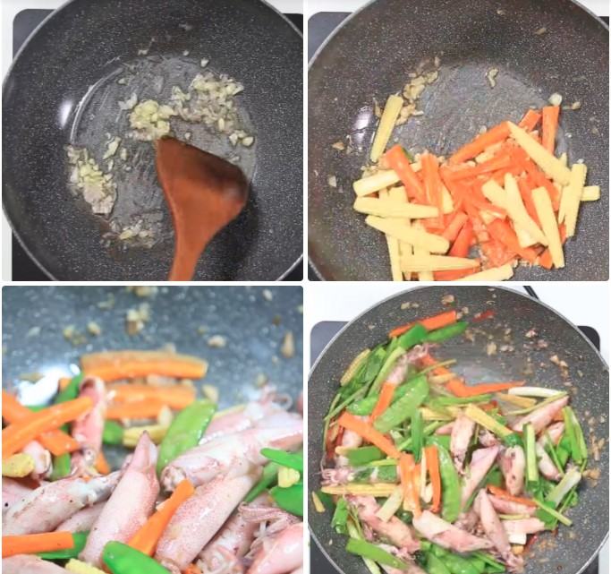 Khi hành tím, tỏi thơm, bạn thêm lần lượt cà rốt, bắp non, đậu Hà Lan, mực vào xào khoảng 2 phút.