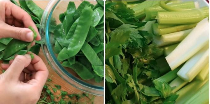 Cần tây, hành boa rô rửa sạch, cắt khúc vừa ăn khoảng 2 lóng tay.