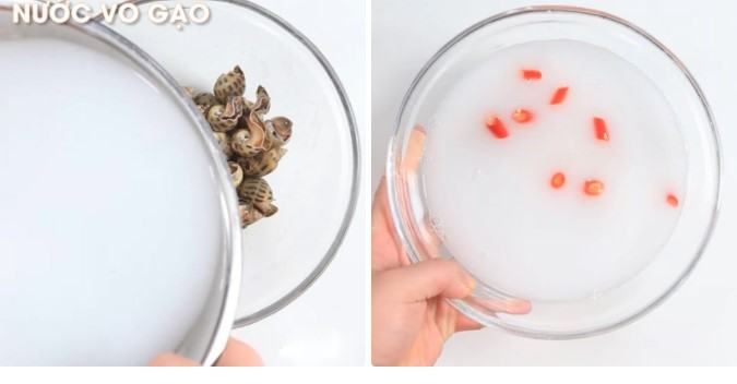 Ốc mua về nên được ngâm trong nước vo gạo được cho thêm vài lát ớt, ngâm trong khoảng 1 – 2 giờ. Sau đó vớt ra rửa lại với nước sạch vài lần là được.