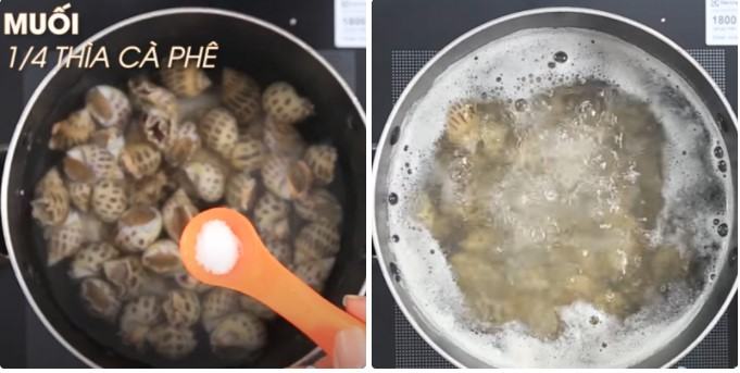 Bắc lên 1 nồi nước nấu sôi, cho hết ốc hương vào luộc sơ qua với 1/4 thìa cà phê muối. Luộc khoảng 5 phút thì vớt ra, chờ ráo.