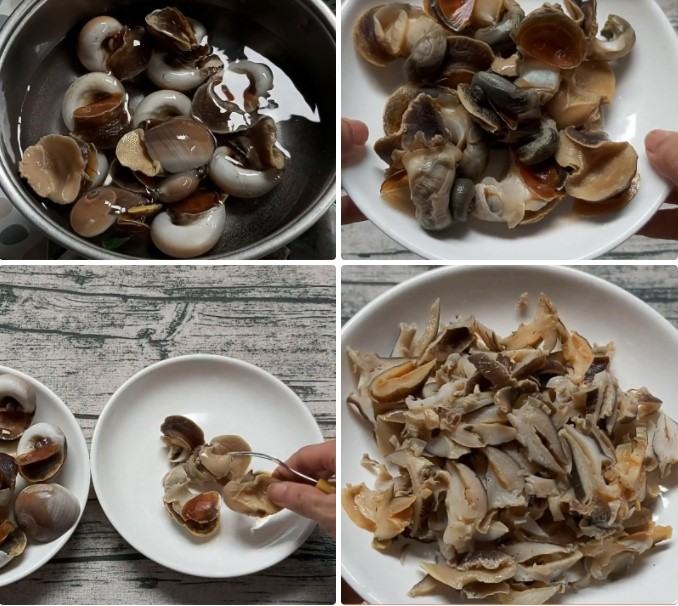 Cắt bỏ phần ruột ốc ở đuôi rồi cắt thịt ốc thành những lát nhỏ vừa miệng.