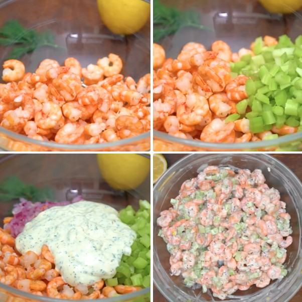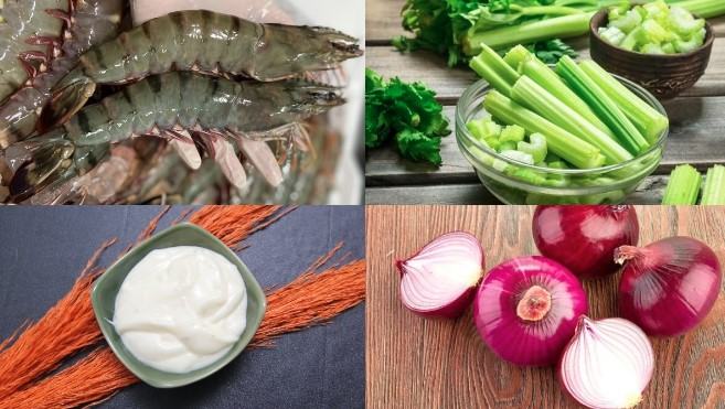 Bước 3: Sử dụng một cái bát lớn, cho vào mayonnaise, giấm gạo và mù tạt, trộn chúng lại với nhau cho đến khi thật mịn. Cho tôm vào hỗn hợp, trộn đều. Tiếp theo cho thêm cần tây, ớt chuông vào và trộn đều tất cả.