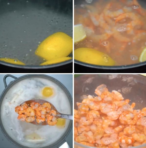 Bước 2: Chuẩn bị một nồi nước khác, đun sôi, cho tôm đã lột vỏ vào luộc chín. Sau đó vớt chúng ra, cắt miếng vừa ăn để cho ráo nước.