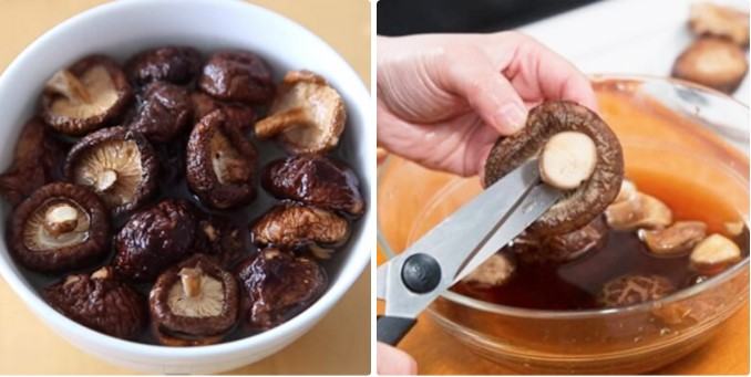Nấm hương ngâm trong nước cho đến khi nở ra, cắt bỏ gốc nấm, rửa sạch lại và để ráo.