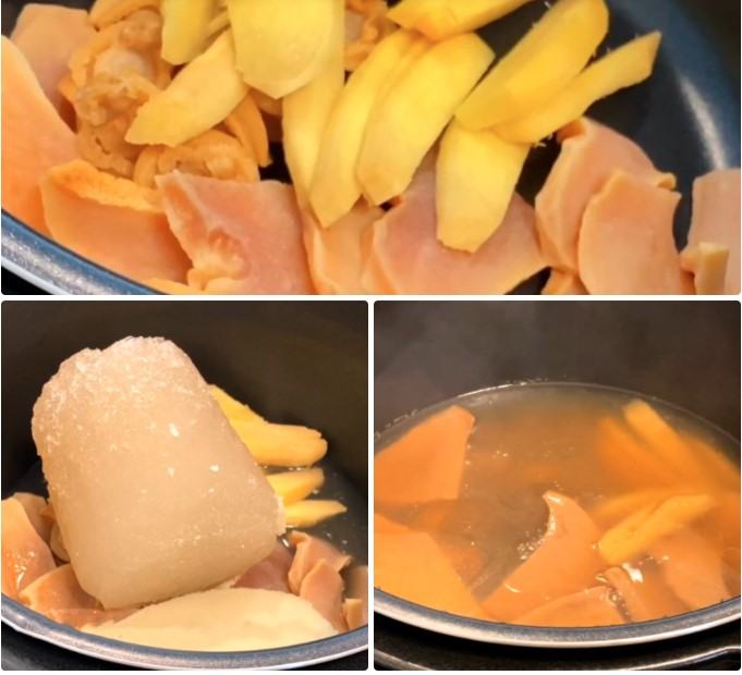 Bắc nồi nước sôi lên bếp, cho bào ngư, gừng và nước dùng gà vào, giảm lửa vừa hầm và ninh trong 2 tiếng.