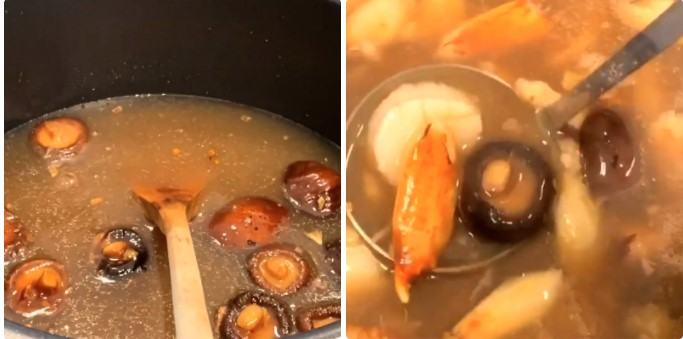 Xào nấm khoảng 1 phút thì cho nước hầm bào ngư vừa nấu vào và đợi sôi. Sau khi nước hầm sôi thì cho thịt sò điệp vào.
