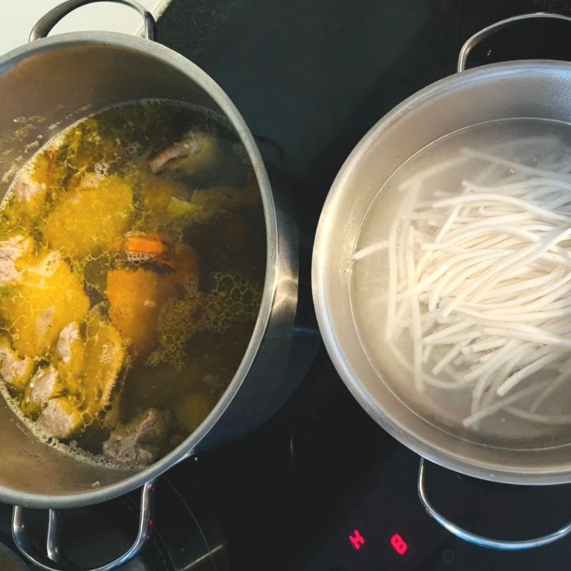 – Chan nước lèo, rồi cho ít hành xắt nhỏ, ăn nóng kèm giá, salad, đầu hành thái chỉ và muối ớt xanh sẽ rất ngon.